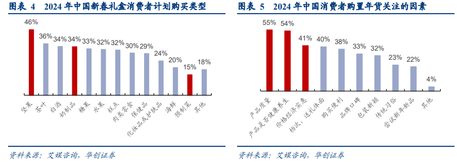 综合草根调研反馈,今年返乡客流恢复背景下,走亲访友明显增多,拜年礼赠需求进一步改善,同时健康化、实用性、性价比等趋势基本延续。➢ 今年整体礼赠需求进一步改善。去年部分居民因家中长辈担心复阳、老人尚未免疫等选择减少线下拜访,草根调研反馈,今年基本不再受此影响,礼赠需求相较23年进一步恢复,甚至出现一定补偿性拜年送礼,整体年节氛围更浓。➢ 产品健康化等趋势延续。据艾媒咨询,24年在中国消费者购置年货关注的因素中,“产品是否健康养生及有功能性”已成为TOP 2,超过上一年的“价格经济实惠”。根据我们草根调研,尽管今年礼品以水果烟酒、肉蛋奶、零食礼盒为主,但观察到仍有相当一部分年轻人给家中长辈购置营养补剂、冲泡谷物,此外零添加调味品、更加健康的坚果礼盒等也已成为年货购置的主流选择之一。➢更加注重产品性价比及实用性。根据草根调研,我们观察到周围人购置年货时,呈现出可以接受“买贵的”,不少今年过节选择购置有机食品、黄金首饰、奢侈服装等,商务部重点监测零售企业绿色有机食品、金银珠宝销售额同比增长10+%。但也观察到他们对水果、烟酒等通用食品类,无法接受“买贵了”,而且在产品选择上更注重年货是否匹配收礼人实际需求。