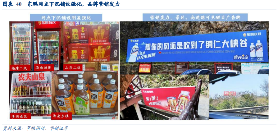 1、非乳饮品:龙头强化礼盒布局,东鹏预计动销旺盛,RIO推广更加均衡龙头加大礼盒装布局,礼赠饮料中高性价比受欢迎。春节期间可乐、鲜橙多、椰汁等传统节庆饮料堆头陈列明显,养元铺货力度较大并通过折扣、赠品吸引消费者,动销表现较好;东鹏、农夫等主打即饮场景的饮料龙头亦加大礼盒装布局:东鹏小金罐礼盒在湖南下线市场铺货力度大,农夫NFC果汁礼盒主攻中高线,福建、山东的二线以上城市均可见明显堆头陈列。此外,礼赠场景下高性价比饮料受到欢迎,如山东等部分地区东鹏礼盒动销优于红牛、折扣力度更大的六个核桃销售优于露露,且节后出现断货。椰子水、无糖茶等风口概念陈列增加,大包装迎合性价比及家庭消费。椰子水、无糖茶相关产品在货架上的陈列面占比明显增加,甚至可见相关品类集合堆头。品牌与SKU数量亦明显丰富,椰子水可见if、三麟、馋大师、春光等品牌,无糖茶消费者对头部品牌认可度较高,三得利、东方树叶货架空置情况及货龄优于其他品牌。此外,东方树叶、三得利、脉动多推出大包装或连包产品以迎合性价比及家庭消费,湖南、海南低线市场可见东鹏菊花蜜等铺货。东鹏营销发力,网点下沉铺货明显强化,预计春节动销旺盛。春节期间东鹏全国化营销发力,草根调研反馈,海南、贵州等地景区及多地高速公路沿线,可见醒目的东鹏特饮、补水啦广告牌。同时公司网点下沉铺设力度较去年明显强化,除了增加堆头铺设,多地商超、景区、人流量较大的步行街边可见冰柜陈列,在湖南乡镇许多超市有新品多喝多润铺货、甚至炒粉与烧烤店内也见到东鹏陈列。公司全国化营销大力推进,配合网点下沉力度,以产品矩阵形式充分把握返乡、礼赠、旅游等场景需求,预计春节期间动销旺盛。