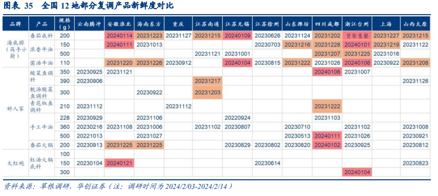 火锅料竞争仍激烈,颐海动销相对最优,天味地域分化明显。从草根调研来看,各地区火锅底料铺货及动销差异较大,地域品牌、餐企、商超自有品牌均有布局,其中西南地区本土品牌陈列较多,华东地区海底捞及天味占优。整体来看,火锅底料竞争较为激烈,格局较为分散,小龙坎、德庄等火锅品牌入局,但今年基本无大面积推广活动,浙江台州、安徽淮北好人家复调产品折扣力度在7折-8折不等。从库龄来看,海底捞日期相对更优,多在1-2个月左右;天味地域分化明显,在安徽淮北、四川成都表现更佳,普遍在1-2个月左右,而在云南腾冲、山东潍坊库龄相对较长。天味鱼调料同比变化不大,好人家群众基础更优,而大红袍加速渗透,江苏、浙江、安徽等地均有陈列。