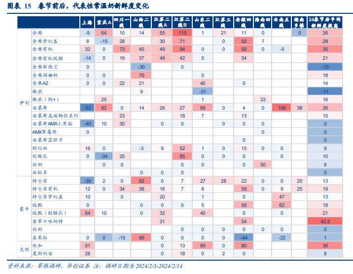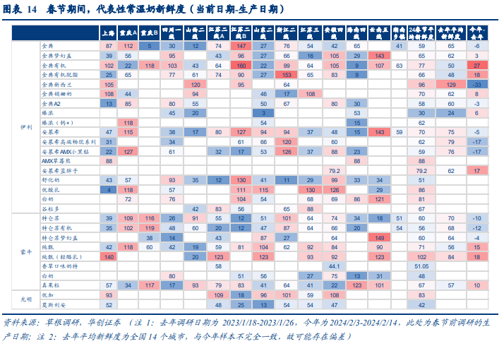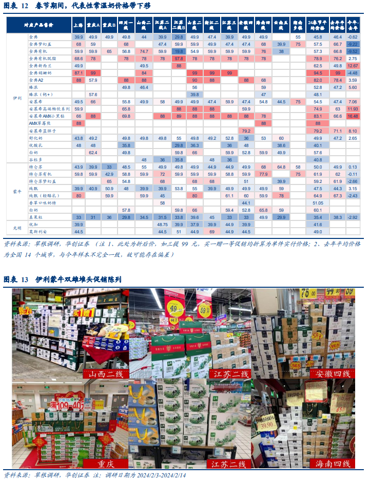 节前新鲜度略弱于往年,特仑苏、安慕希货龄同比改善。受消费需求复苏偏弱及上游原奶供给过剩影响,今年节前产品新鲜度总体弱于去年,金典系列、纯甄系列及臻浓、舒化奶等产品库龄均多增加15-30天。但部分核心单品货龄同比有所改善,如常温白奶中特仑苏系列表现占优,经典款及有机产品货龄同比降低10天及以上;常温酸奶中,安慕希基础款及部分高档品类库存天数同比降低,预期受益于前期公司严格的库存管理及品类地位进一步巩固。年节实际动销看,促销对产品动销拉动明显,其中白奶品类延续强劲。春节期间受益于返乡人流较多,常温白奶动销保持强劲,其中促销产品是消费者购买的主要品类,商超主要折扣的基础品类新鲜度平均提高13-35天,无折扣的高端产品春节期间动销相对较差。分品牌看,白奶经典款单品动销普遍较好,其中伊利金典系列货龄普遍消化20-40天,优于特仑苏(13-20天);更高端的白奶在低线城市生产日期几乎不变,高线城市情况略有改善;常温酸奶中安慕希与纯甄货龄平均消化15-25天,安慕希动销略好于纯甄。