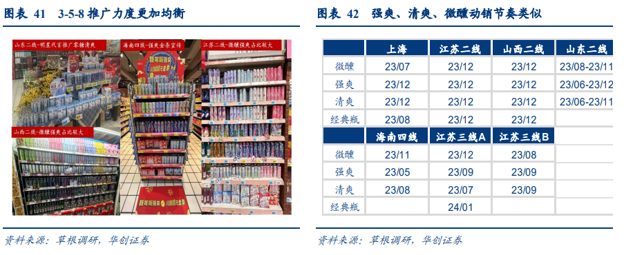 RIO陈列仍显著占优,3-5-8推广力度更加均衡。预调酒品类中,RIO商超陈列依旧占优,零食量贩渠道可见产品销售,折价力度合理(约为商超8-9折)且包装与商超不同,有利价格体系与品牌形象稳定。与去年强爽爆火热销相比,今年强爽、清爽、微醺货龄无明显差异,公司对三大单品的推广力度亦更加均衡,可见“喝强爽赢金条”与清爽明星代言宣传牌,陈列面仍是上微醺≈强爽>清爽,但清爽折扣力度通常略大于微醺与强爽。