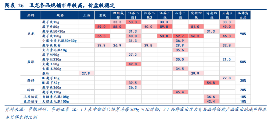 ➢ 魔芋爽/素毛肚:卫龙为绝对龙头,高铺市率和品牌优势引领竞争。魔芋爽的布局玩家基本为全国性知名零食品牌,其中卫龙为绝对龙头,品牌露出度高达90%,盐津为第二梯队。调研发现,卫龙魔芋爽的定量装均价高于其他品牌,但品牌形象深入人心且露出度较高,仍是消费者首选。2023年10月,卫龙推出新品小魔女素毛肚,新品在调研中的露出度为20%,铺货于二三线城市。为推动小魔女快速打开市场,卫龙推出50g搭赠30g的促销活动,均价降低至31元/500g,较盐津的新品大魔王更具价格优势。