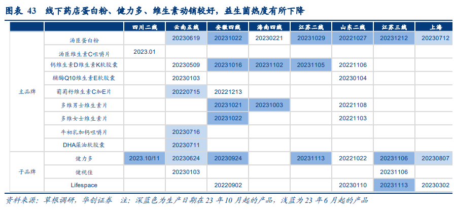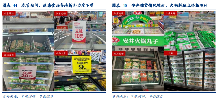 2、保健食品:药店面向中老年产品热销,益生菌库龄同比延长 药店面向中老年产品热销,益生菌热度同比回落。保健品行业经历23Q1疫后需求高涨至回落平稳后,消费者健康意识仍有所提升。今年面向中老年人的产品销售更好,预计主要系由于保健品消费礼赠属性比去年更加明显(去年疫后自用需求相对较高),如蛋白粉类产品可帮助中老年人提升免疫力,钙维生素D维生素K软胶囊、健力多等产品有益骨骼健康,库龄大多短于去年,表现优于褪黑素、辅酶Q10等品类。益生菌产品方面,去年XBB毒株影响消化系统带动热销,今年则有所降温、库龄相对较长。速冻食品今年整体热度平稳,米面制品动销强于火锅料。今年返乡人群同比增加,但整体速冻需求相对平稳。据草根调研反馈,汤圆和水饺仍然是主要铺货品类,预制菜铺货规模小于其他速冻,米面以三全和思念为主,火锅料主要为安井、桂冠、雨润、三全、海霸王、海欣。部分城市如淮北、无锡、台州速冻竞争较为激烈,折扣力度较大,其余城市主要以配合商超的满减活动为主。值得一提的是,在零售量贩店里也开始上线速冻食品如皇家小虎。分品类看,速冻米面制品动销优于火锅料,两者库龄基本在2-3个月;预制菜动销一般,部分产品生产日期基本仍在23Q3,但今年除夕不放假叠加预制菜宣传力度增强,一线城市预制菜过年期间动销环比提速,调研反馈年轻人对预制菜的接受程度更高,中老年人接受程度一般,消费者教育仍需加强。 安井各线城市渗透情况较好,散装火锅料热度更高。安井火锅料系列、米面制品、预制菜系列在调研各线城市均有铺货,且部分陈列位置较明显,火锅料普遍有独立冷柜陈列,部分城市还配备有专门的导购员,冻品先生渗透率提高,南通、无锡、太原均观察到冻品先生铺货。动销方面,据草根调研反馈,安井散装系列动销优于锁鲜装系列,散装补货频率更高,火锅料产期基本在23年12月至24年1月,促销力度增强,多地推出“满49减20”,“小厨满30减10” 等促销活动,锁鲜装部分产品折扣至9.9元。1)白酒:价值布局,首选“老四大”。无论是短周期跟踪反馈,还是长周期白酒运行逻辑重构,老四大酒企稳增驱动力底牌仍足,但名酒向下挤压会更加明显,从回款、库存等都会显现剧烈分化。而市场对消费复苏预期普遍较弱,板块估值已极具性价比,短期蕴含超跌反弹机会,长线价值凸显。标的上:首先聚焦确定性核心龙头茅台(经营底牌充足,业绩稳若泰山,中长期价值凸显)、汾酒(动销有望延续惯性式较快增长);其次算清底线价值,寻找超跌修复,推荐五粮液(动销优秀,价值底线较高)和老窖(经营稳健性和报表持续性仍确定);持续推荐区域龙头,市场相对景气、业绩仍有确定性的古井、今世缘。2)大众品:精选结构弹性,把握超跌机会,龙头定价重构。一是中期逻辑确定且兼具弹性的饮料板块,包括东鹏(势能强劲余力充足,高成长持续性无虞)、中炬(困境反转);关注新品驱动逻辑百润。二是短期超跌且中长期逻辑清晰的餐饮供应链和啤酒,包括立高、安井、华润、青啤等。三是中低速时代消费龙头定价范式切换,优选自由现金流优秀的高股息率龙头,推荐伊利、关注双汇等。需求复苏不及预期、原材料价格大幅波动、草根/渠道调研存在一定误差等。组长、首席分析师:欧阳予