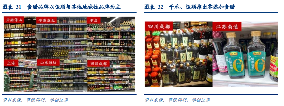 区域性差异依旧明显,零添加渗透度进一步提高。根据多地草根调研反馈,各地食醋品牌仍旧以恒顺与其他地域性品牌为主,其中安徽淮北、江苏南通、上海等地恒顺货架资源显著更优,恒顺醋货龄多在2-4个月,相较上一年(1-2月)有一定提升。云南腾冲偏好保宁醋、山西老陈醋,重庆以千禾、三不加、保宁为主,浙江台州宝鼎康乐醋动销良好,山西太原当地陈醋品牌占主流,四川成都则反馈保宁醋陈列相对更多,千禾、海天、李锦记等醋类亦有陈列。此外,调研观察到各品牌零添加陈醋铺货普遍增加,但动销一般,如江苏南通主打“零添加”的千禾生产日期在9-11月。