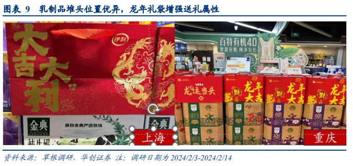 企业紧握年节旺季机会,堆头位置依然显眼,龙年礼袋强化送礼氛围。在前期需求复苏偏弱背景下,年节旺季龙头紧握动销机会。在前期提前召开订货会的基础上,今年节日期间多地乳业产品区域均设立在收银台、电梯、进门处等人流必经之地,乳制品堆头陈列位置优异,配备新年专属袋增强送礼属性,折扣力度较大,年后新鲜度有明显提高。堆头伊利略优、品类更为丰富,节庆企业均主推高端品相。从各地堆头陈列面来看,伊蒙双雄依旧优势显著,多地伊利陈列数量占居首位,略优于蒙牛,且伊利安慕希AMX系列、金典系列的细分品类更多更丰富;其他品牌则以光明、澳牛、君乐宝、蝶泉等地方性品牌为主。同时,导购人员热情促销,重点推荐金典、安慕希、特仑苏等高端产品。