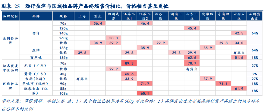 全国性连锁大品牌的标准化拓店和价格优势更强,供应链优势重要性愈加凸显。在新兴区域,零食量贩业态尚不成熟,消费者认知度较低。在此背景下,全国性连锁大品牌和区域性品牌同台竞技。赵一鸣、零食有鸣、零食优选作为门店数量居全国前五的全国性连锁大品牌,其标准化拓店能力更强,在各线城市开出的门店均装潢明亮现代、经营管理规范,引流品较当地商超具备低价优势,用“低价”、“便宜”加深消费者认知,吸引较多人流。而区域性连锁品牌如海南地区的可加零食、云南地区的零食很嗨,其门店经营不够规范,最重要的是低价优势并不明显,从而也无法深化消费者认知,人气和经营情况不及全国性连锁门店。景气细分竞争梯队分明,目前价盘基本稳定。鹌鹑蛋、魔芋爽、蒟蒻果冻是近年来增速较快的新兴休闲零食赛道,卫龙、劲仔、盐津等诸多知名零食品牌陆续加码。整体而言,各赛道处于早期快速成长期,目前各品牌间有序竞争、共同成长,价盘较为稳定,同时产品、渠道、品牌等禀赋较优的品牌实现领跑。➢鹌鹑蛋:劲仔、盐津铺子为赛道第一梯队。鹌鹑蛋休闲零食布局企业可以分为3类,分别为以劲仔、盐津、百草味为代表的全国性品牌,以无穷、贤哥为代表的知名蛋类零食品牌和区域性品牌。从品牌露出度、各品规铺货情况看,劲仔、盐津铺子为第一梯队,无穷为第二梯队。劲仔具备袋装和盒装两种定量装,整体露出度略胜一筹;盐津铺子于24年1月中旬推出的战略子品牌“蛋皇”在江苏某二线城市有铺货。劲仔、盐津的定量装产品每500g价格比区域性品牌更低,或系推测劲仔盐津的规模效应、更优的生产工艺、更低的耗损率可以使得与区域性品牌进行“价格相当甚至更低、质量更优、品牌更好”的竞争。