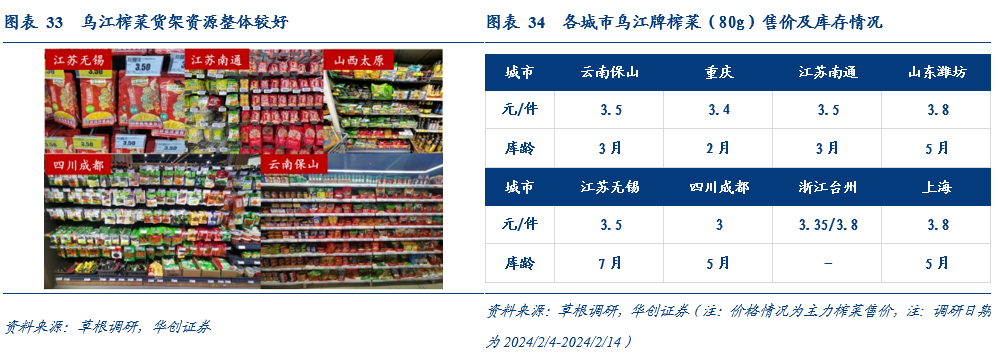 乌江榨菜整体陈列依旧最优,但新品铺货动销不及预期。铺货端,乌江榨菜多分布在商超最醒目陈列位,占榨菜陈列区域1/3及以上,空架率较高,仅山东潍坊等个别地区反馈乌江陈列资源不佳。库龄端,乌江榨菜当前终端库龄多在3-5个月,与去年同期基本持平。动销端,乌江单价略高于其他品牌且无配套促销活动,主力榨菜(80g)在3.5-3.8元左右,新品动销一般,四川成都减盐萝卜干、榨菜酱等库龄较老。