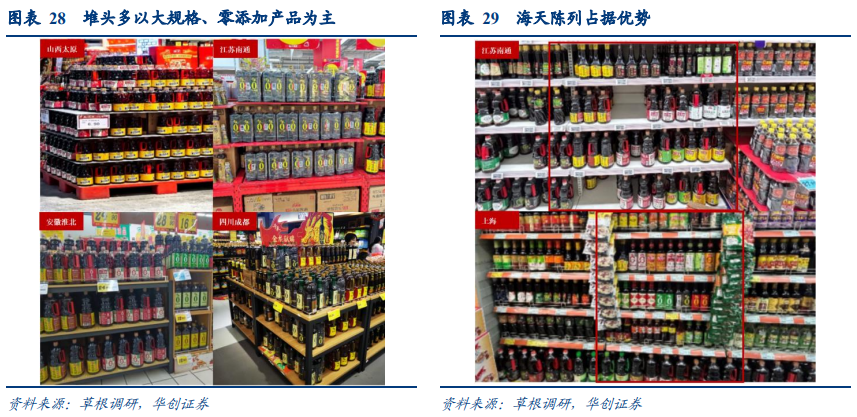 ➢ 蒟蒻果冻赛道中喜之郎一骑绝尘。喜之郎作为果冻行业龙头,也为蒟蒻果冻赛道的绝对龙头,自2021年新推出蒟蒻果冻以来,依托原有渠道快速铺货,在我们调研的样本城市中品牌露出度100%,其中120g袋装蒟蒻果冻铺货最广,基本全面覆盖各线城市。盐津铺子走性价比路线,定量装价格优惠。调味品促销堆头较少,仍以大规格产品为主,全国范围内海天货架资源更优。据各地草根调研反馈,今年调味品堆头数量依旧较少,基本为2-3个,其中以海天、千禾为主,小部分混搭欣和、味达美、加加等区域强劲品牌进行销售,产品主要为零添加及大规格包装。货架资源中西南地区味事达、千禾等品牌更具优势,其余区域海天终端占有率与品类丰富度更高,千禾铺货力度继续加强,零添加系列产品堆头资源丰富,李锦记、厨邦铺货紧随其后,欣和、加加、太太乐等其余品牌陈列以少数主力产品为主。此外,今年各地商超的健康酱油铺货明显增多,且多居于排头等显眼位置,零添加酱油海天及千禾陈列最广,呈现双寡头局面,低盐酱油李锦记独占鳌头,但欣和六月鲜轻盐酱油也已经开始铺货,有机酱油千禾、海天、李锦记、欣和等均已进场。