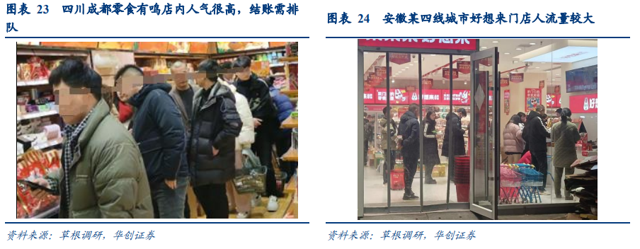 餐饮延续上年景气,本地宴席相对平稳,旅游餐饮显著更优,其中大B好于小B。➢ 小B闭店或有增多,连锁大B表现更加稳健。本次返乡草根调研,一些低线城市或者县城,观察到张贴“转租启示”的小餐饮店面相较去年有所增多,或侧面印证23年餐饮需求仍在修复过程中,同时也发现连锁品牌如霸王茶姬、肯德基等开店数目明显增加,尽管看似客单价更高,但也发现低线城市更愿意为品牌溢价付费,头部大B在年节期间表现也明显更优。➢ 本地餐饮氛围平稳,旅游餐饮表现更优。草根调研普遍反馈,今年春节本地餐饮&宴席等氛围相较上年基本持平或小幅提振,推测或与去年报复性消费带来高峰、不少门店春节期间歇业有关,而旅游餐饮消费景气明显更高,下沉市场(返乡人流增加)、旅游城市(如哈尔滨、景德镇等)表现相对更优,据美团、大众点评数据显示,春节假期前5天,异地消费者贡献订单量同比增长186%。商圈等本地消费业态景气恢复,折扣零售业态表现更佳。受人流返乡及大量出游影响,今年外出消费亦十分旺盛,据商务部大数据监测显示,除夕全国示范步行街客流量、营业额同比分别增长26.9%和21.7%,同时据中国电影报道, 24年春节档总票房达80.2亿,刷新中国影史春节档票房纪录,总观影人次超过去年、再创新高。而从零售业态来看,今年草根调研普遍反馈,此次返乡观察到赵一鸣、零食很忙等零售量贩门店大量涌现,且观察到不少宝妈进行购买、节前生意相当火爆[4],此外其他折扣业态如折扣牛、好特卖,甚至包括折扣水果店、服装店等也不断涌现。[4] 据中国证券报报道,零食很忙公共关系部经理易礼钧反馈,春节期间县城和乡镇的门店销售火爆,这段时间下沉市场门店的生意几乎是平常的三四倍。今年的‘年货档’,全国门店数量增加翻倍,配送体量同比增长很大,整体供应稳定。
