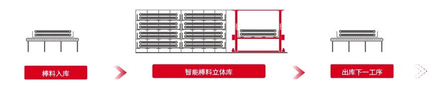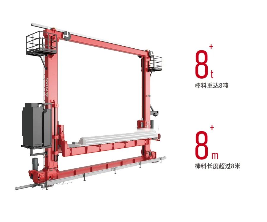 智能棒料立体库主要由有轨巷道堆垛机、出入库输送系统、悬臂式货架及WMS/WCS系统等构成。该棒料库共有538个货位,采用2台米亚斯双立柱单深位堆垛机,棒料载具长度8米,宽度近1米,重量超过8吨,总库容量近4000吨。根据系统指令在作业时间内完成指定数量的棒料存取要求,与其他系统协作最终满足企业生产需求。