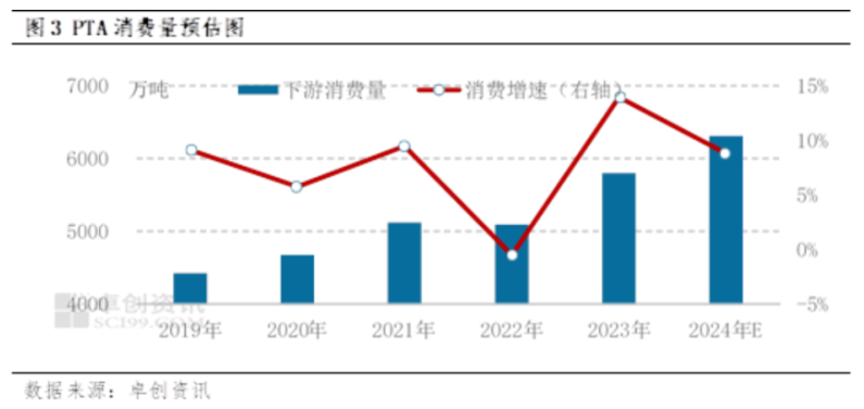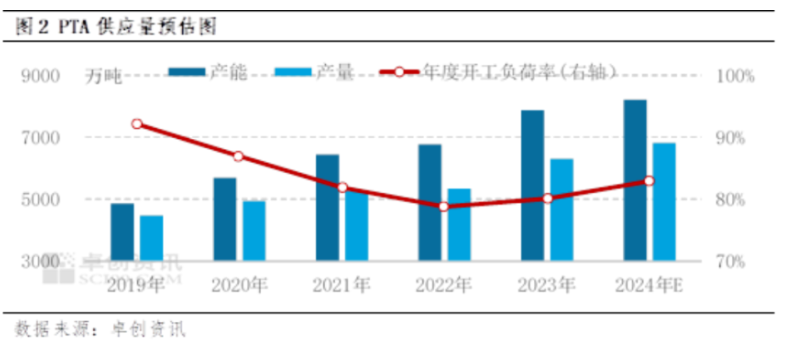 虽然2024年新增PTA产能仅450万吨,但2023年投产的新产能较多,产能将兑现为产量。2024年计划新增PTA产能450万吨,预估淘汰落后产能232.5万吨,预估2024年PTA产能将达到8215万吨,产能增速将达到4.35%。预估2024年PTA产量6813.0万吨,同比增长8.05%,PTA供应过剩的预期较强。