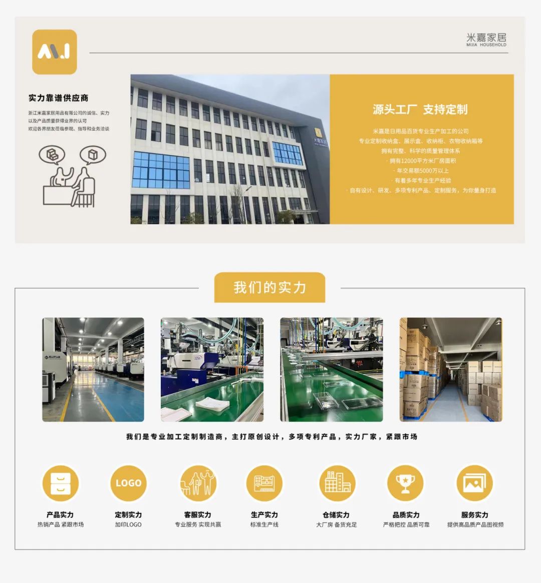 浙江米嘉家居用品有限公司,前身为台州市黄岩周华塑料厂(成立于2003年),现坐落于浙江省台州市黄岩区江口街道,工厂占地面积12000平方米,是一家集开发、生产、销售等一体的创新型企业。公司现拥有2000万的设备,海天注塑机40台,中央集中供料系统,以及生产流水线27条,网络化、信息化、智能化管理。涉及产品主要以家居用品、潮玩收纳、厨房收纳等。米嘉家居一贯坚持“质量第一,用户至上,优质服务的宗旨,凭借着高质量的产品,良好的信誉,优质的服务,客户遍布国内外。米嘉家居期待成为您忠实的朋友和合作伙伴,共创互惠的未来。