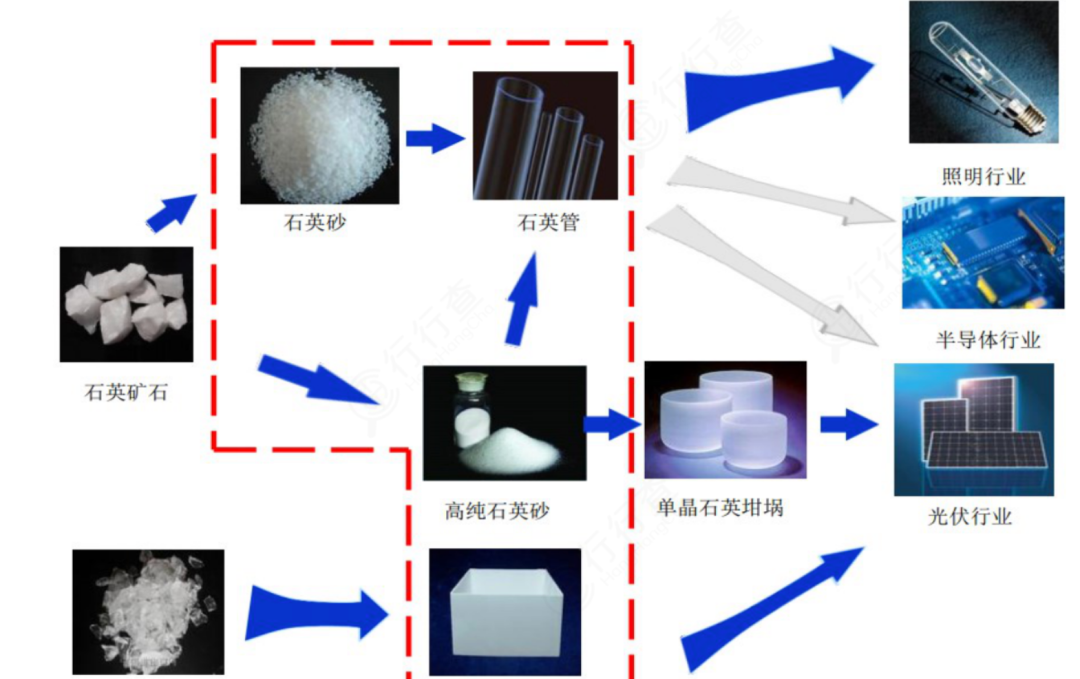 高纯石英砂因其独特结构优势具备耐高温、低热膨胀性、高度绝缘、耐腐蚀、透光性强等特点,在高科技与高端制造中具备极高的战略地位。近年来下游应用领域多数正处于高速发展阶段,产业扩张迅速,对高纯石英砂需求较大。高纯石英砂是石英玻璃、石英管、石英坩埚等的主要原料,下游应用领域从中低端到高端可以分为,光源行业(99.5%~99.99%)、高端光学器件、激光器件(99.99%以上)、光纤通信、半导体、光伏、微电子等领域(99.995%~99.9999%)。