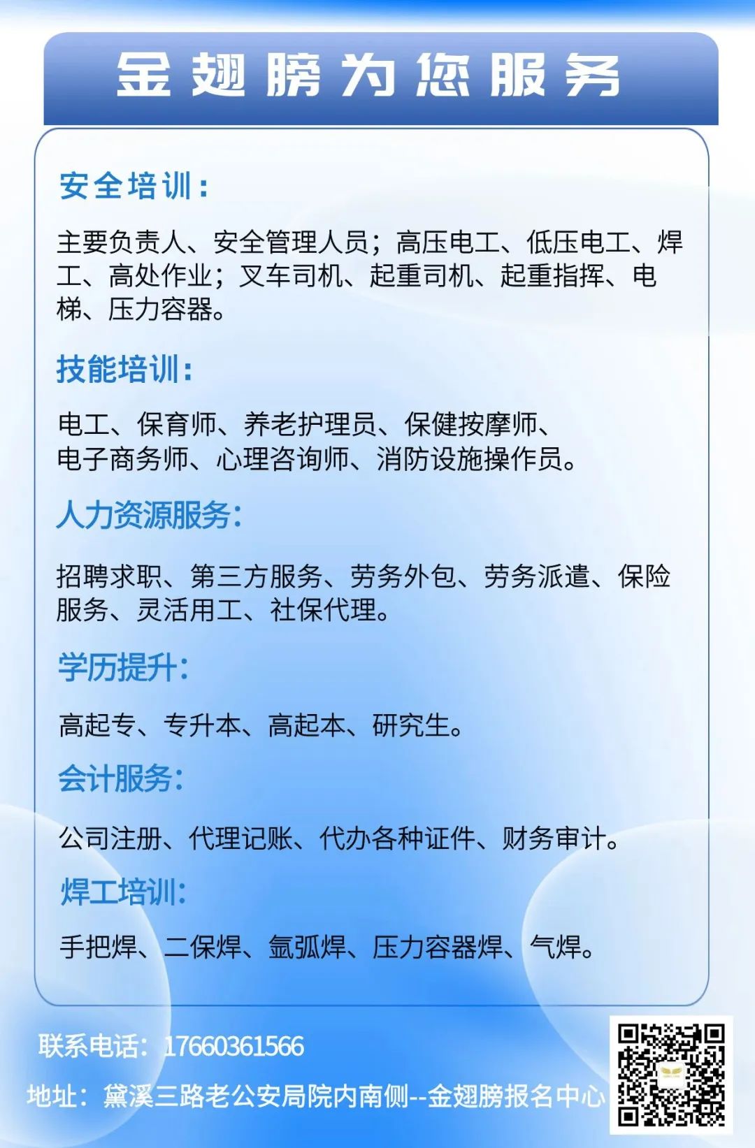 地址:黛溪三路老公安局院内南侧--金翅膀报名中心