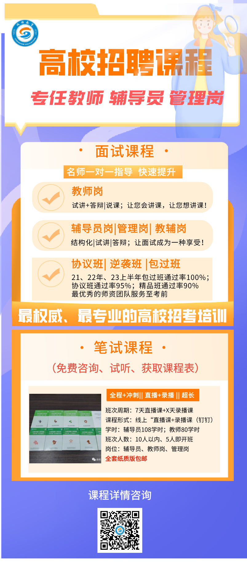 采用百分制计算应聘人员总成绩,总成绩满分为100分。最终成绩计算方法:最终成绩=试讲成绩×50%+面试成绩×50%。