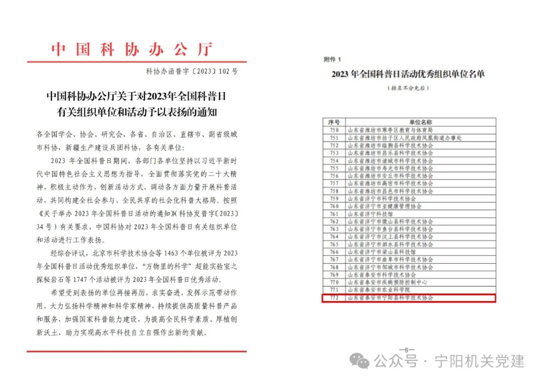 (三)创塑“科普进万家 共建新宁阳”工作品牌,提升公众科学素质。组建宁阳县科普专家库,首批吸纳各领域科普人才109名、团队8个。争取省、市基层科普行动计划和省科普示范工程项目5个;认定市级科普教育基地5家、科普示范学校4家、青少年科普教育示范基地3家;认定乡村(社区)科普e站60个;建立乡村儿童分级阅读研究中心实践基地1处。组织开展“科普之春”“全国科普日”等主题科普活动1000余场次,编发《科普日历》4000册、科普挂图1200套;争获2023年“全国科普日”系列活动省级优秀组织单位3个和优秀活动7个、市级优秀组织单位10个和优秀活动30个;组织承办各级青少年科技竞赛活动13项;获评市级农技协龙头协会2个、乡土人才4人。