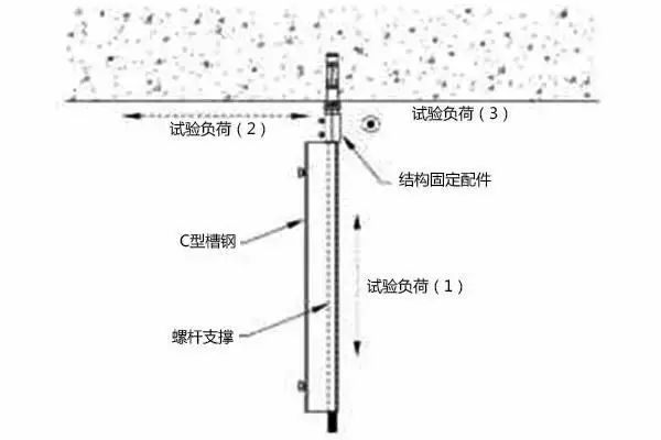 结构固定配件施加试验荷载应先与建筑结构垂直施加,然后再与建筑结构平行施加。对于多用途支撑座,则在施加第二道试验荷载时应与该结构固定件相平行。随后再与上述平行试验荷载的方向成 90°来施加。如果结构固定配件能够处于 90°的位置并与前述第二道试验荷载处在同一平面内,则可沿该方向施加第三道荷载。