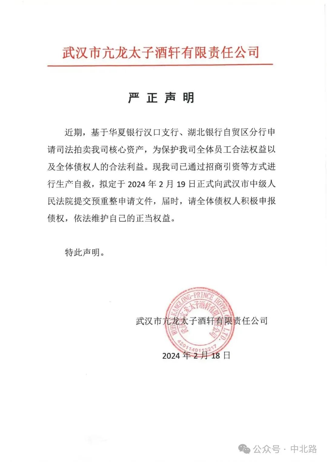 微信公众号中北路获悉,武汉企业:武汉亢龙太子酒轩严正声明一则。
