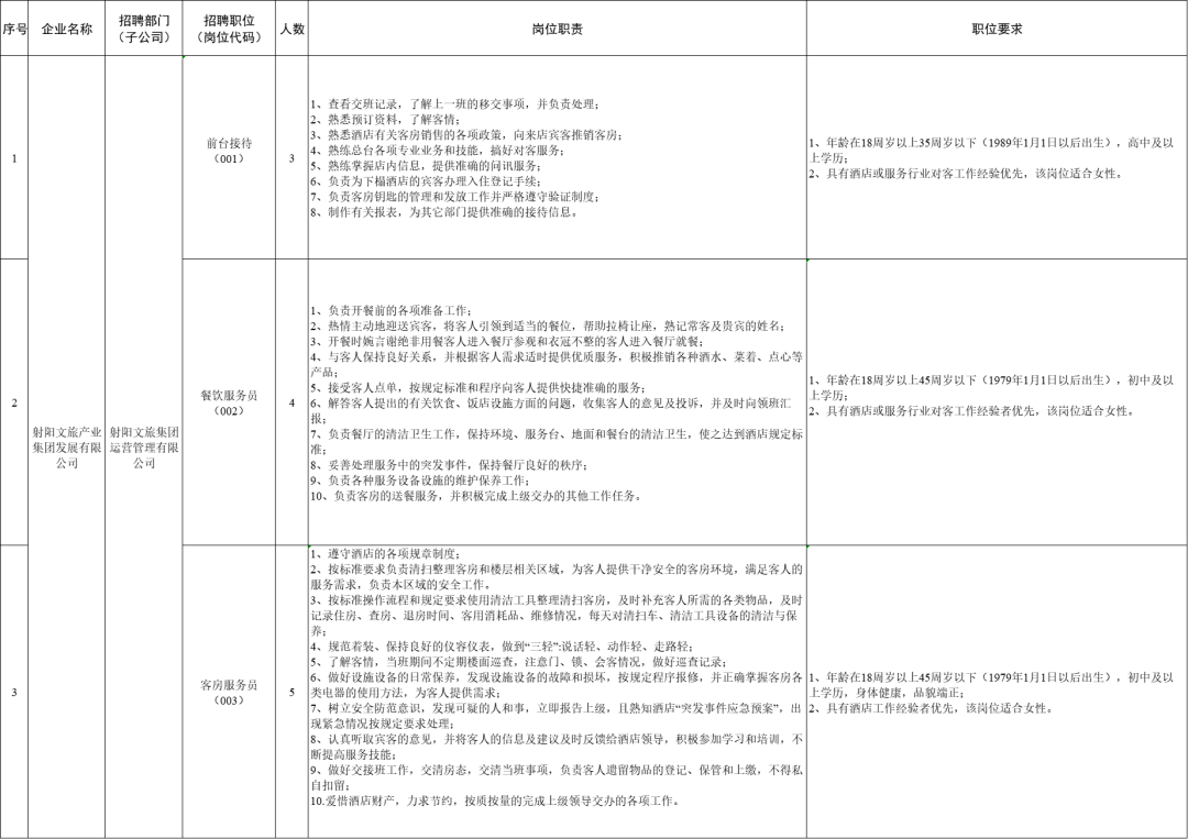 (四)具体岗位要求详见附件一:《射阳文旅产业集团发展有限公司下属子公司公开招聘劳务派遣工作人员岗位表》。