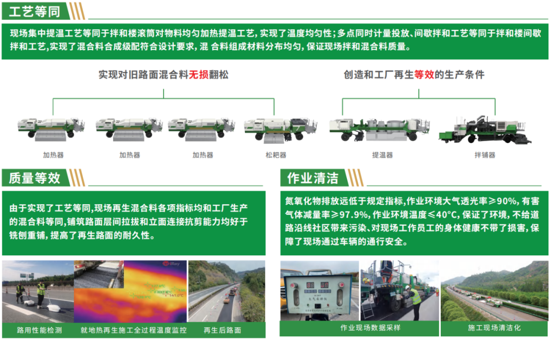 累计投入大量人力、物力和财力对影响该项技术发展和应用的技术难题及设备进行了系统的研究和创造,攻克了多项技术难题,取得了五个核心能力和五项核心技术,实现了三大核心目标,创造出了完全自主知识产权的沥青路面清洁化就地热再生成套技术及JP-6000机组第一代科研成果,成果实现了物料受热均匀、混合料合成级配均匀、路面材料分布均匀。
