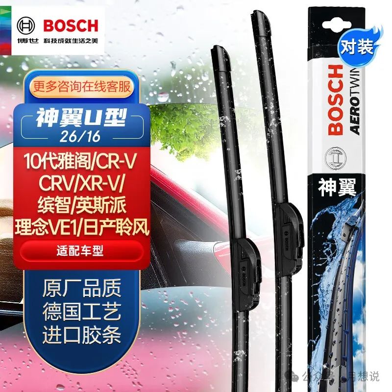 这款雨刷器是博世的风翼系列,是一款专业型的无骨雨刷器。它适用于特定的车型,如 16-18 年的途胜、十代雅阁、CR-V、XR-V、缤智、比亚迪 G6、M6、景逸 X5、皓影等。它的特点是有导流板设计,利用风压使雨刷更好地贴合玻璃,提升刮拭性能和安全性。它的合成橡胶技术搭配导流板,可以挂水更加干净、无声。它的 U 型接口,安装更加快速便捷。如果您想要一款专业、高端、高效的雨刷器,这款博世雨刷器是值得推荐的。