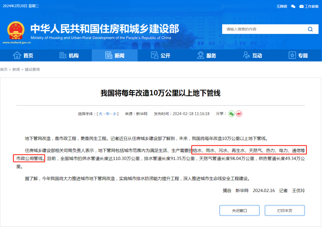 2024年2月16日,住房城乡建设部发布了一项重要消息:未来,我国将每年改造10万公里以上的地下管线。这一举措将为市政、机电、通信工程企业及从业人员带来新的机会和发展前景。