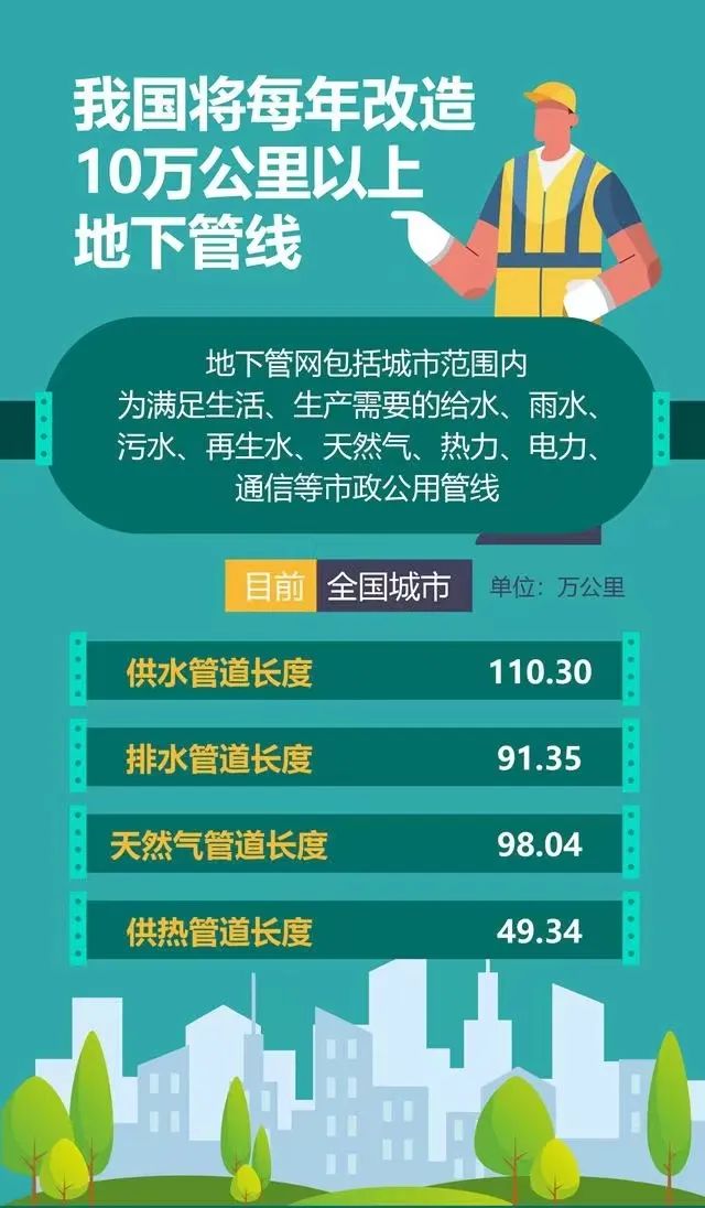 文件内容:住建部相关负责人近日表示,未来,我国将每年改造10万公里以上地下管线。2024年,我国将大力推进城市地下管网改造,实施城市排水防涝能力提升工程,深入推进城市生命线安全工程建设。