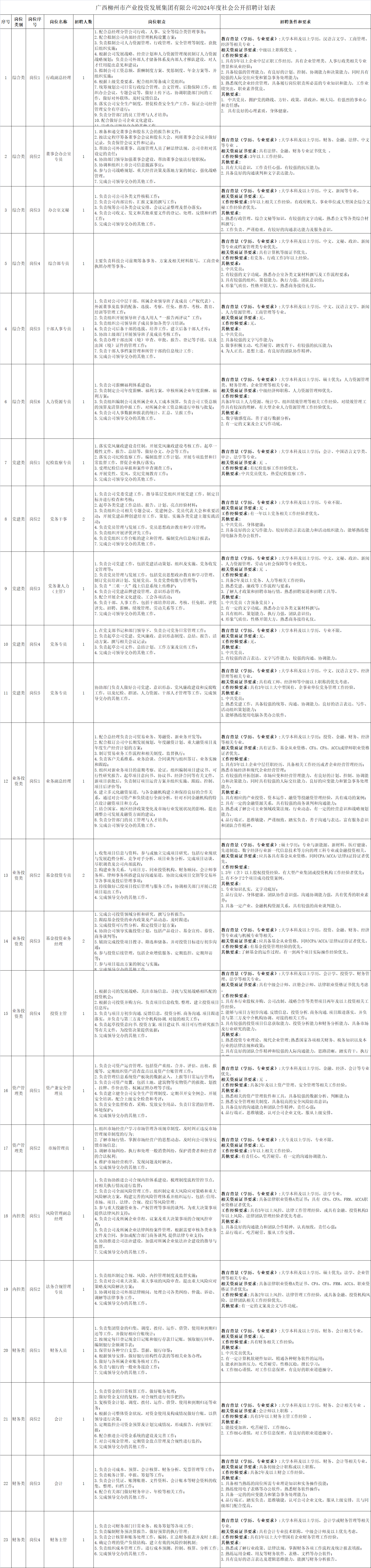 此次公开招聘23个岗位,具体岗位职责及招聘条件详见附件1《广西柳州市产业投资发展集团有限公司2024年社会公开招聘计划表》。