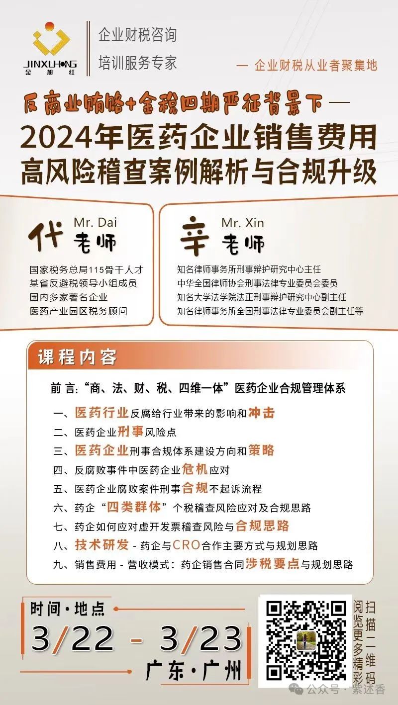 3月22-23日在广州召开反商业贿赂风暴+金税四期严征背景下,“2024医药企业销售费用高风险稽查案例解析与合规升级”研修班。重点剖析药企销售费用税务风险关键点,帮助药企合规升级。