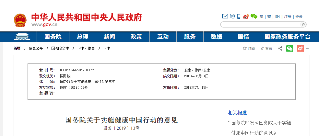 2019年7月15日,国务院印发《国务院关于实施健康中国行动的意见》。