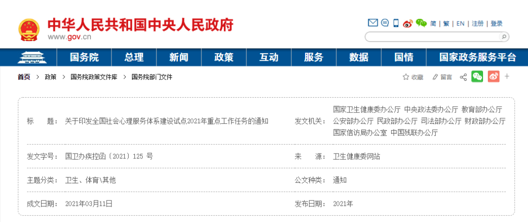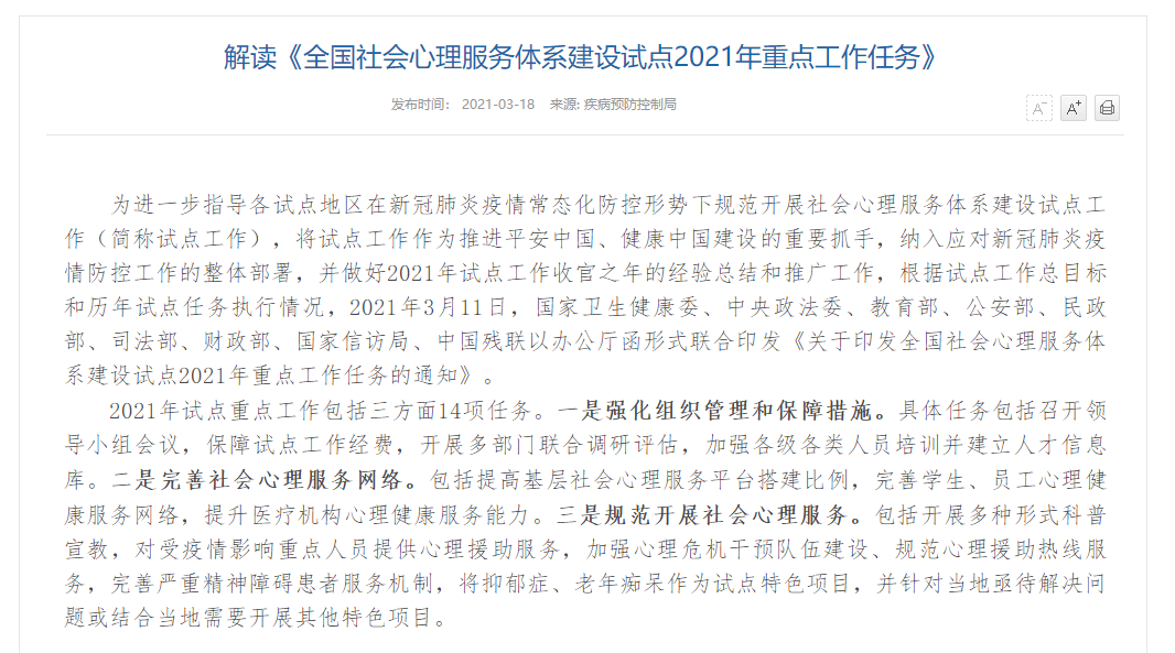 2021年3月11日,国家卫生健康委、中央政法委、教育部、公安部、民政部、司法部、财政部、国家信访局、中国残联以办公厅函形式联合印发《关于印发全国社会心理服务体系建设试点2021年重点工作任务的通知》。