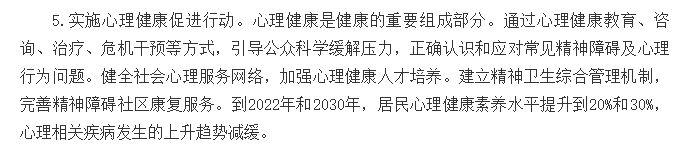健全社会心理服务网络,加强心理健康人才培养。建立精神卫生综合管理机制,完善精神障碍社区康复服务。到2022年和2030年,居民心理健康素养水平提升到20%和30%,心理相关疾病发生的上升趋势减缓。