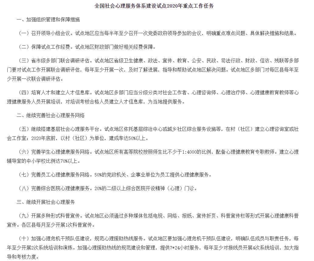 其中《全国社会心理服务体系建设试点2020年重点工作任务》中的第二条“继续完善社会心理服务网络”提出4点: