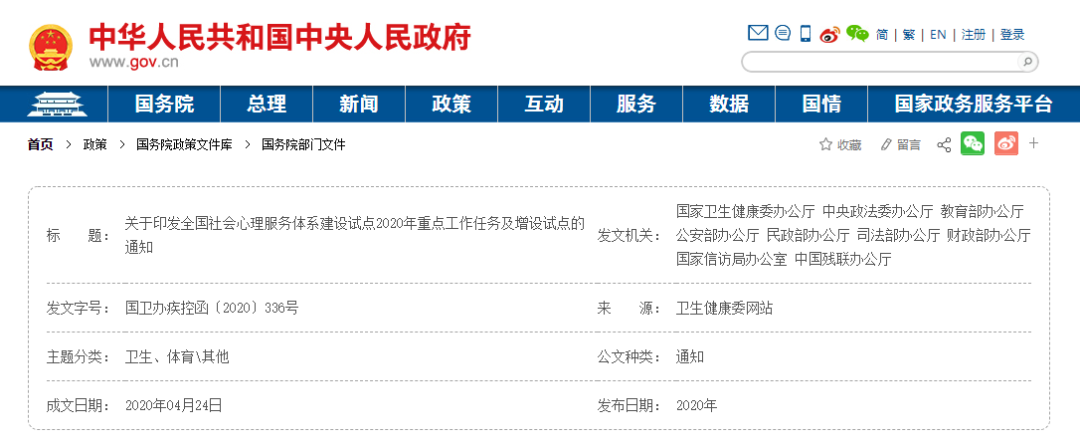 2020年4月24日中华人民共和国中央人民政府发布《关于印发全国社会心理服务体系建设试点2020年重点工作任务及增设试点的通知.国卫办疾控函〔2020〕336号》。