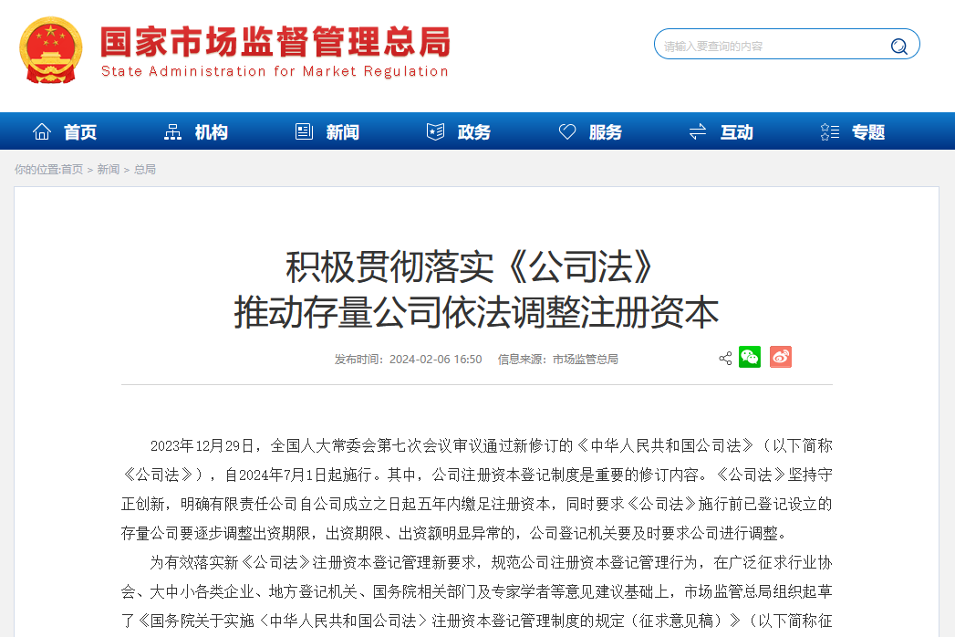 2024年2月6日,市场监管总局网站刊发“关于公开征求《国务院关于实施〈中华人民共和国公司法〉注册资本登记管理制度的规定(征求意见稿)》意见的公告”。该征求意见稿的主要内容包括: