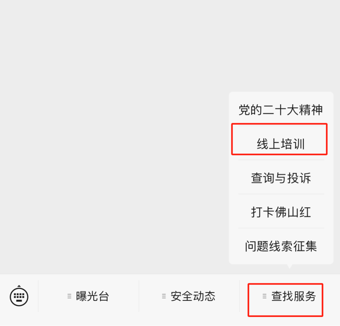 (1)微信搜索【佛山应急管理】或扫描下方二维码关注公众号,点击“佛山应急管理”微信公众号菜单栏【查找服务】,然后再点击【线上培训】。