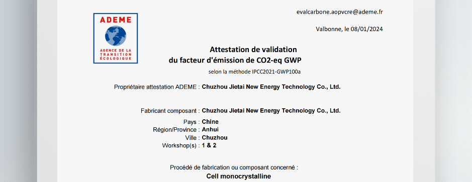 系列产品顺利通过法国碳足迹认证,获得了法国光伏市场的准入资格,为加速实现“碳中和”目标做出了积极贡献。