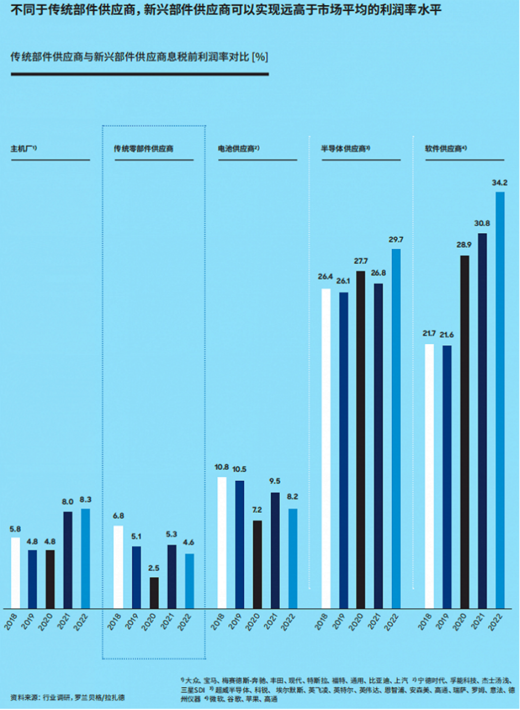 相较于电池、软件、半导体等新兴部件供应商,以博世、采埃孚等为代表的传统部件供应商,盈利能力显著不足。