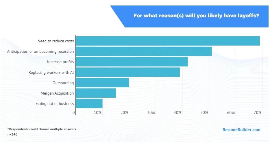 据Resume Builder的一项调查显示,近一半企业领导人透露,对经济衰退的忧虑是他们裁员的的主要原因之一;大约有40%的领导人认为,随着人工智能技术的兴起,他们将通过采用AI来替代人工,这将导致进一步的裁员。