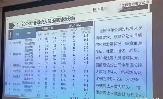 网传的中建某局某公司《2023年各系统人员压降指标分解》,也明晃晃在表格中详细标明了各系统淘汰人数和指标: