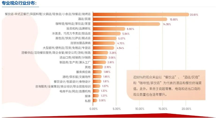 预计展会规模将达到40万平方米,吸引超过25万位来自酒店餐饮、商超零售、休闲餐饮、食品饮料贸易、餐饮投资、旅游休闲等渠道的专业观众到场参观和进行商贸交流;展商数量超过3000家。