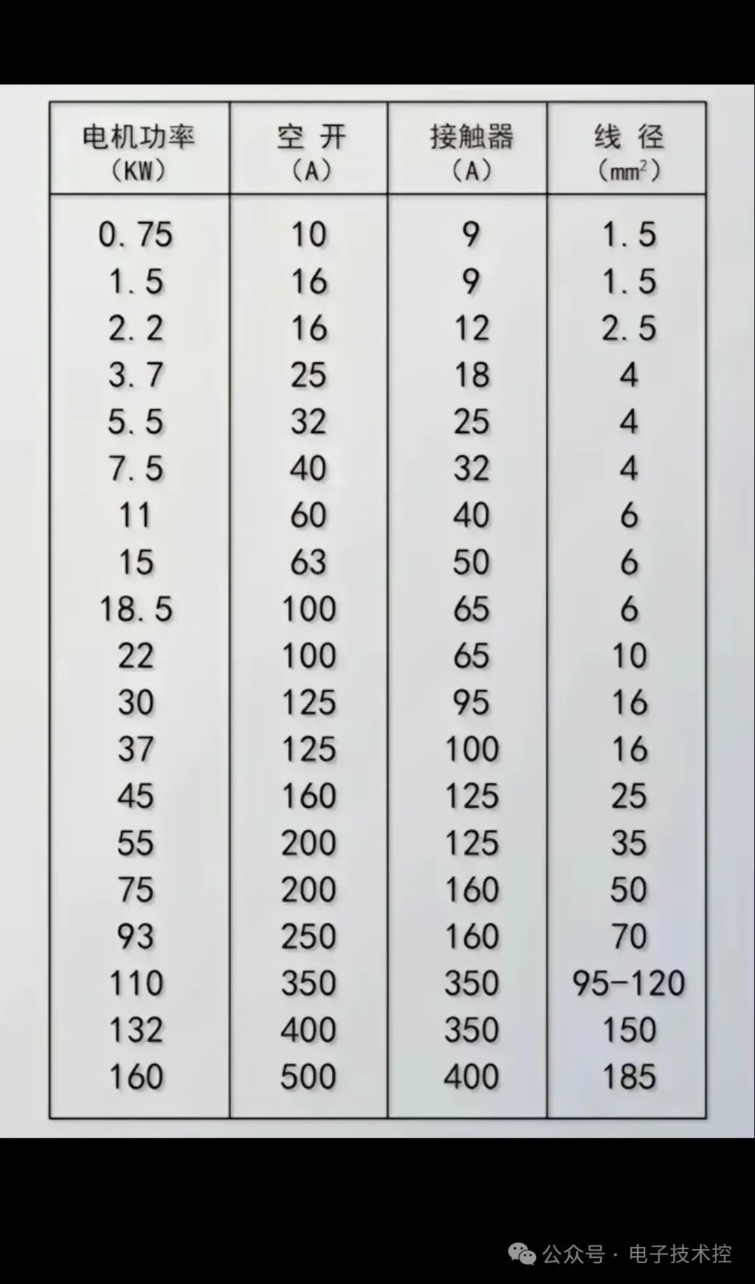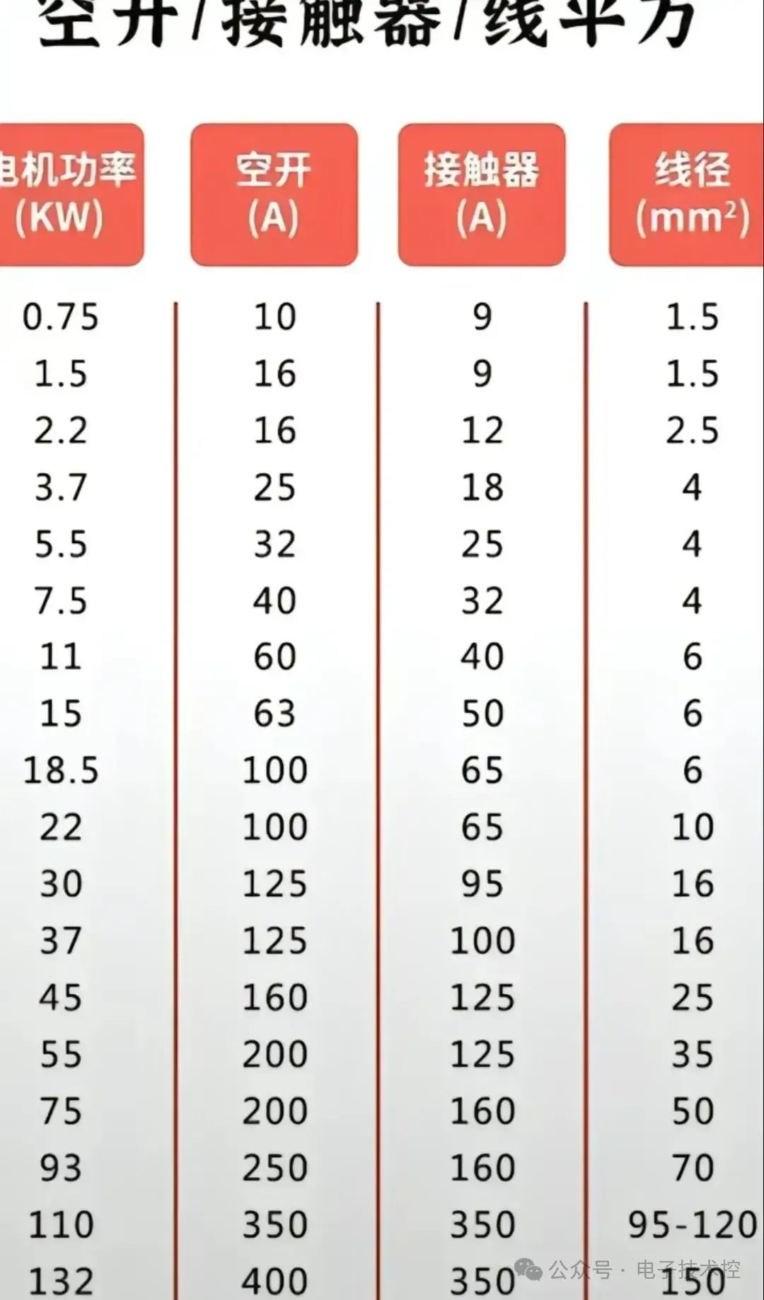 13、空开、接触器、线经大小对照表