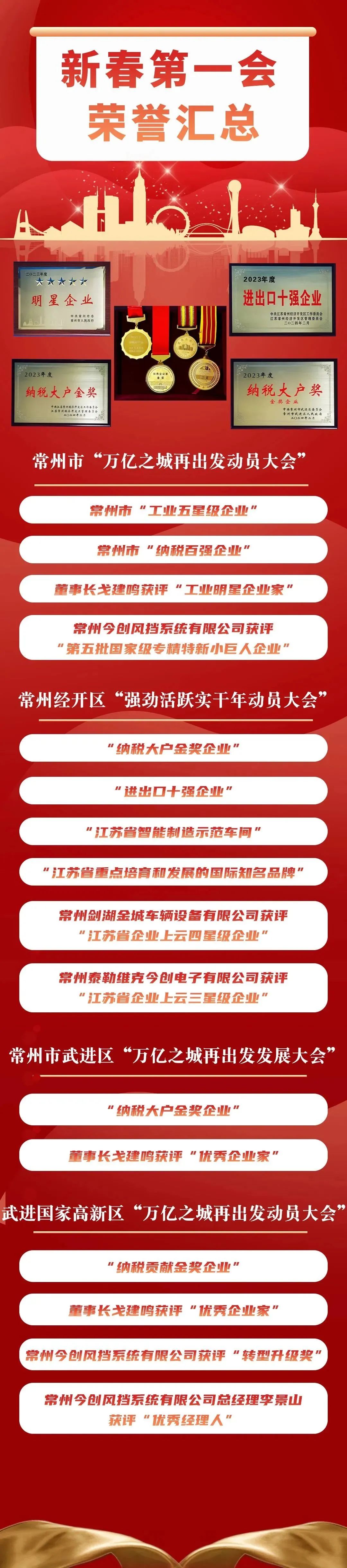 近日,常州市、武进区、经开区、武进国家高新区等各级政府都召开了“新春第一会”,今创控股集团收获颇丰,荣获了常州市“工业五星级企业”、武进区“纳税大户金奖企业”、经开区“进出口十强企业”等荣誉。今创集团全资子公司今创风挡、剑湖金城等公司也受到表彰。