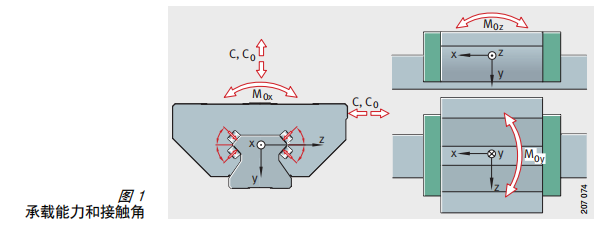 滚动体布置为 X 型布置。能够承受各个方向的力 – 除了运动方向 – 和绕各个轴的力矩,