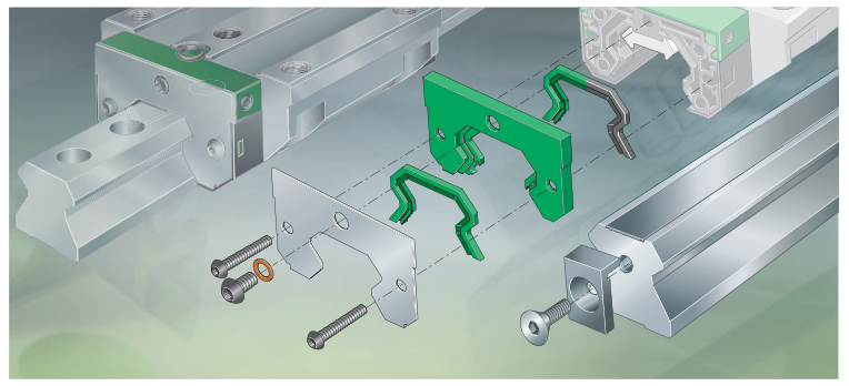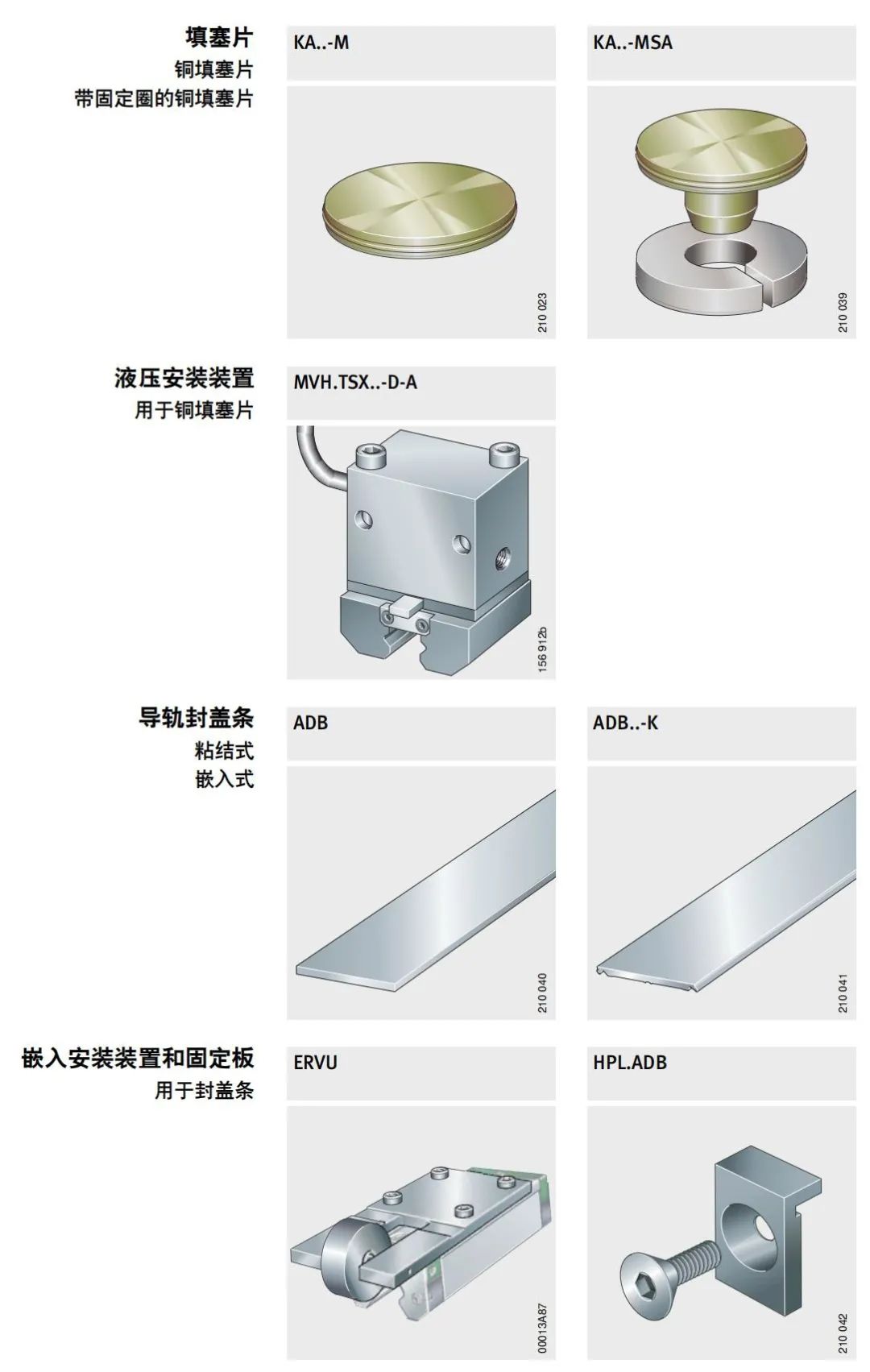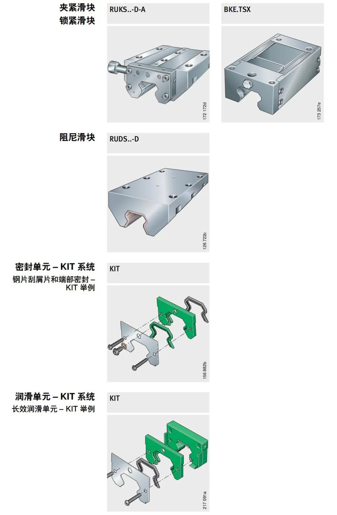 直线循环滚柱轴承及导轨组件拥有广泛的附件。这其中包括导轨用填塞片和封盖条以及相应的安装工具(液压安装工具和压入工具)。对于润滑和密封,有广泛的KIT件。夹紧滑块的应用可以提高周围结构刚性以及消除振荡负载下的微动。锁紧滑块为纯机械式锁紧结构,应用于需要附加刹车和夹紧功能的场合。阻尼滑块可有效吸收消除振动。