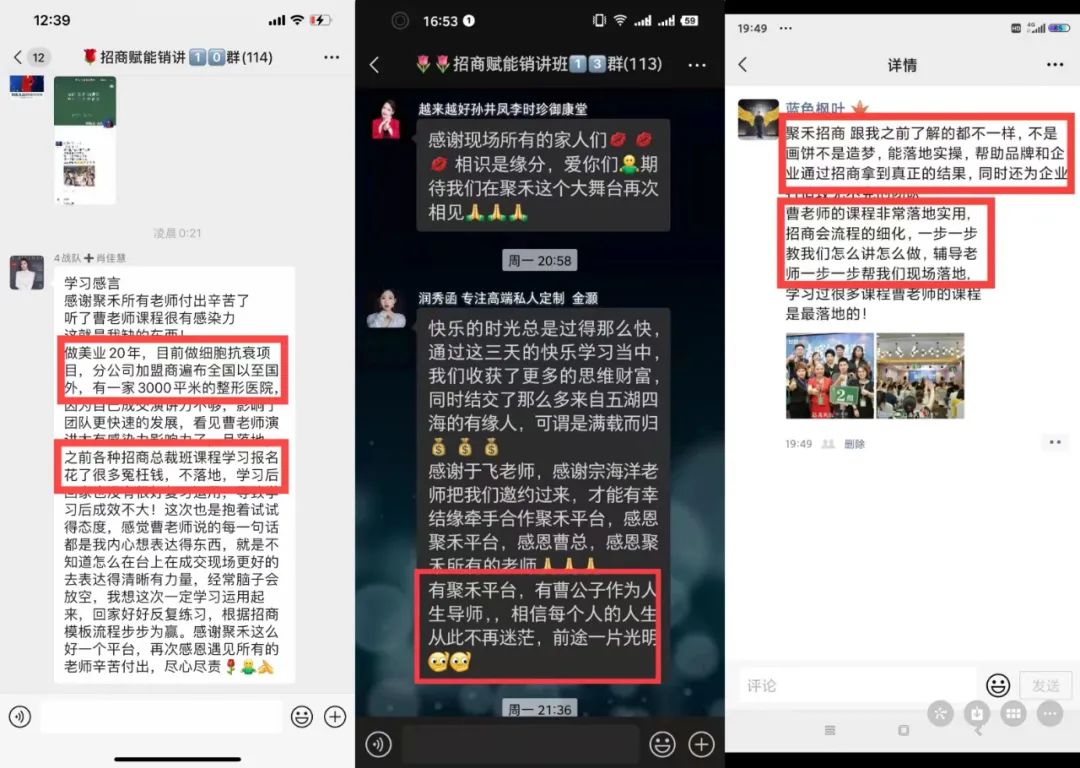 疫情期间,各行各业受到巨大的冲击,立达文旅的王总也不例外,在他几经挫折濒临放弃的时候,偶然一次机会,看到了聚禾,抱着试试看的心态来参加了课程,意想不到的是听完曹公子的课程后,重拾信心,决定与聚禾牵手合作。