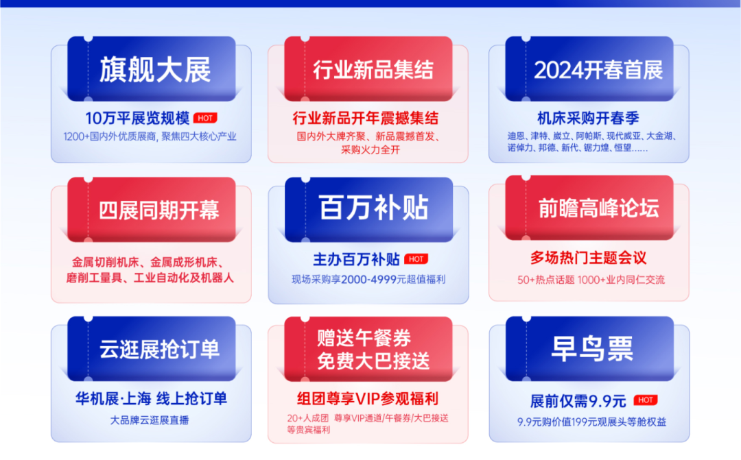 2024年,华机展·上海开春首展,2月28日-3月2日,在国家会展中心(上海虹桥)隆重开启。全新升级为“中国工业机械连锁展”。将持续聚焦行业纵深应用,充分发挥旗舰大展带头作用,四展联动,为机床产业生态链全新升级注入“加速度”。