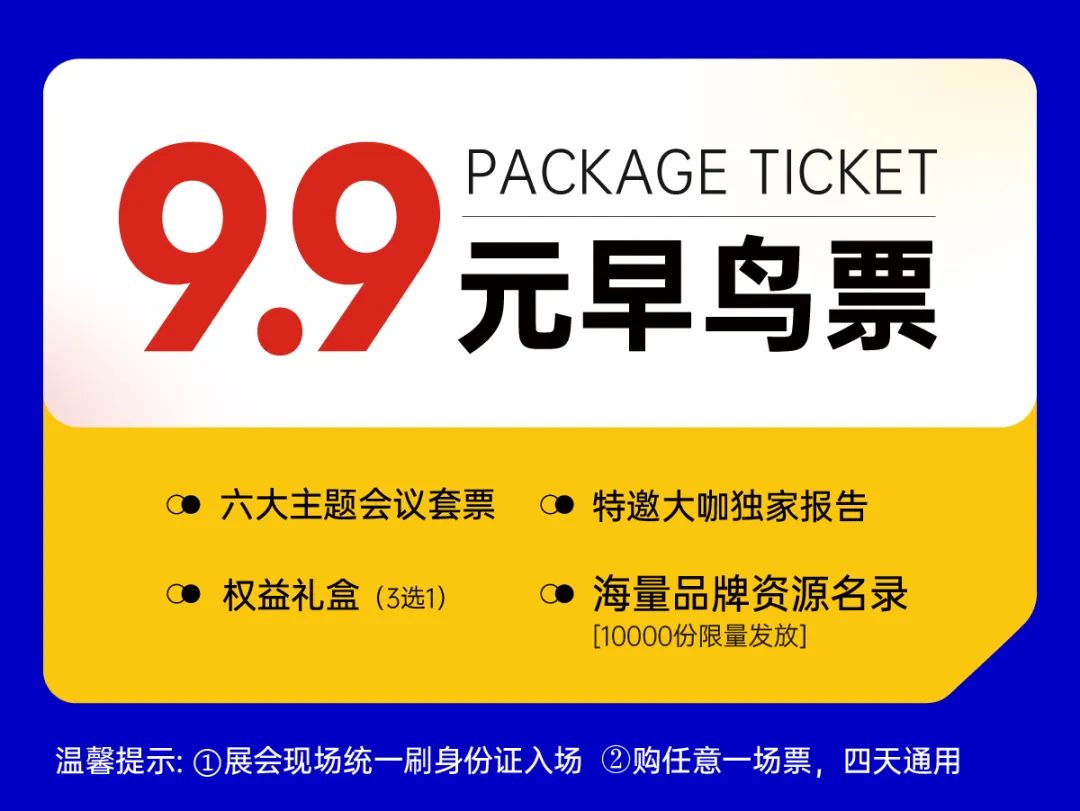 温馨提示:专业展会,非专业/受邀人士不建议注册登记;2月28日08:00前可享受9.9元购票优惠;开展期间票价为39元/人,如有观展需求,建议您提前购票。