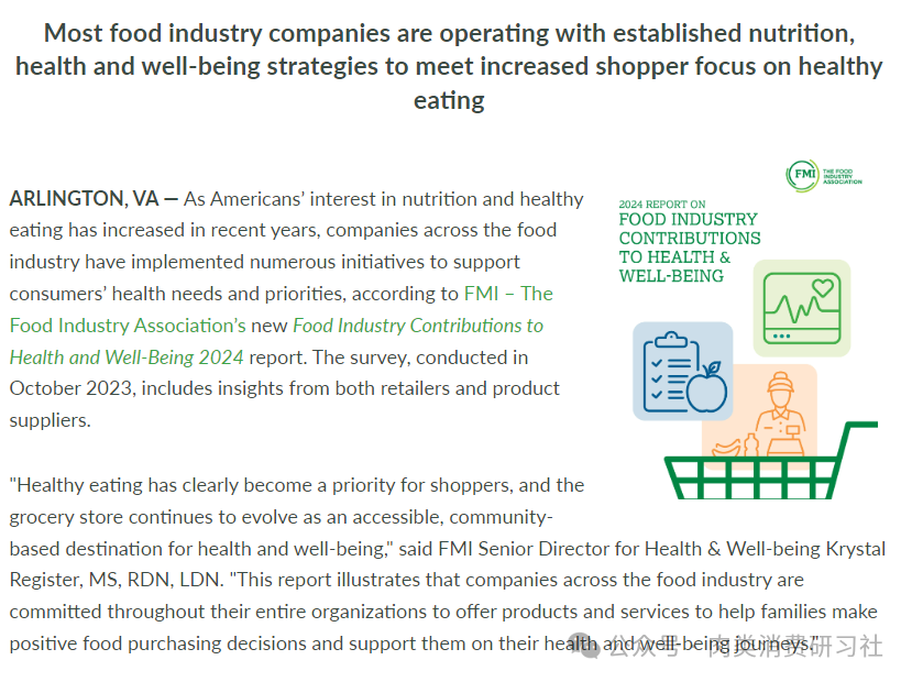 根据美国食品工业协会(FMI)近期发布的一份新报告,杂货店已经发展成为健康和保健指导的中心,大多数(70%)食品工业公司都在实施营养、健康和福祉战略。