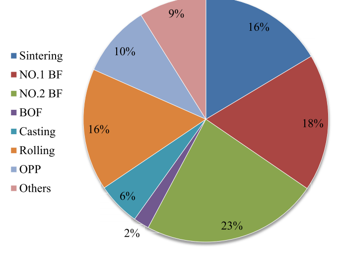 二氧化碳强度用于横向比较。A企业的CO2强度远小于B企业,分别为1678.61 kg/t-PPI和2051.13 kg/t-PPI。因此,企业A在减少二氧化碳排放方面优于b。排放强度高的工艺包括焦化、高炉、烧结和轧制。两种情况下的企业之间的差距主要来自于高炉和轧制工艺,这是由不同的生产结构造成的。B企业使用采购的焦炭和球团,给高炉工艺带来了上游的CO2排放。轧制过程碳排放量的差异主要来源于不同的工艺划分。比CO2排放比例如图9所示;超过60%的二氧化碳排放是在炼钢前的过程中产生的。从碳流图可以看出,进入炼钢过程的大部分碳是由炼焦煤携带的。而一小部分碳由动力煤或上游购买的电力排放。炼焦煤中的碳在炼钢前的过程中被消耗,并转化为在生产过程中循环的副产品气体。副产品气体和上游的电力排放是炼铁过程中主要的二氧化碳来源。电力的上游排放抵扣是指由OPP产生的部分排放应由消费者承担(例如:其他工艺(如烧结、焦化、炼铁、炼钢和轧制工艺)。